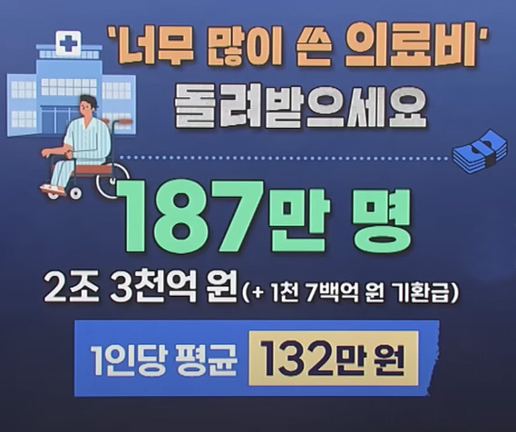 본인, 혹은 가족이나 주변의 누군가가 한 해 동안 병원을 자주 갔다 하시는 분이 있다면 반드시 건강보험금(의료비) 환급 대상이 되는지 확인해 보세요. 대상자 1인당 평균 132만원에 달한다고 합니다. 대상자일 경우 꼭 당사자 본인이 신청을 해야 환급받을 수 있습니다. 환급 대상이라 하더라도 신청하지 않으면 당연히 환급받지 못합니다.