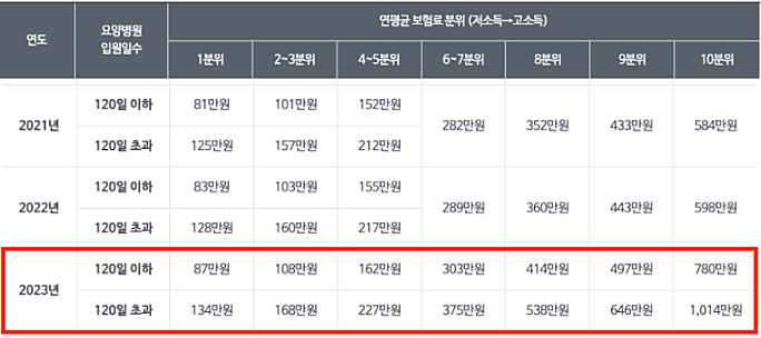 ex) 1분위에 해당되는 사람이 22년 한 해 건강보험 급여 항목 내의 의료비 지출 150만 원을 했을 경우 83만 원을 제외한 67만 원을 돌려받습니다. 다만 요양병원 입원일수가 120일을 초과했다면 128만 원을 제외한 22만 원만 돌려받습니다.