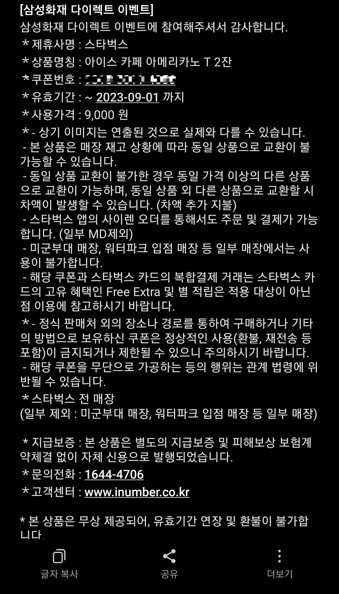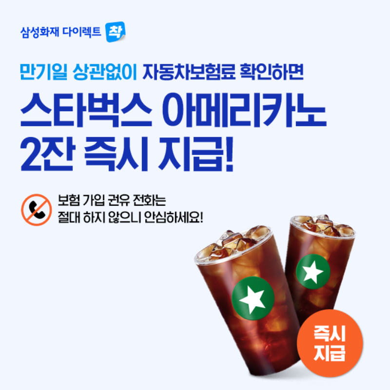 삼성화재 애니카 다이렉트 자동차보험에서 보험료 확인만 하면 스타벅스 아이스 아메리카노 2잔을 즉시 지급한다고 하여 직접 해보았다.
