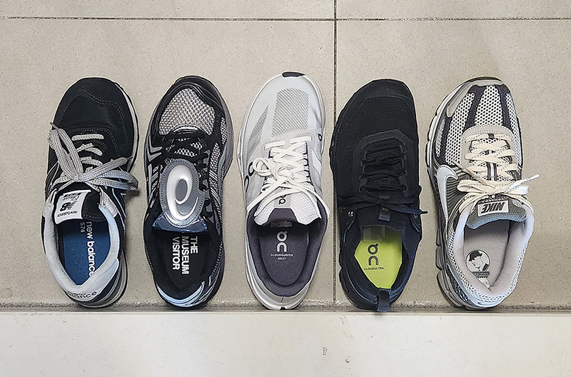 왼쪽부터 뉴발란스 574 / 아식스 젤카야노14 더뮤지엄 비지터 / 온러닝 클라우드서퍼 넥스트 / 온러닝 클라우드 울트라2 / 나이키 줌 보메로5 입니다. (모두 사이즈 255mm입니다.)