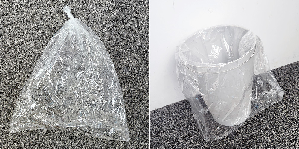 비닐 한쪽을 묶어주면 이런 식으로 쓰레기통 비닐로 활용할 수도 있습니다.